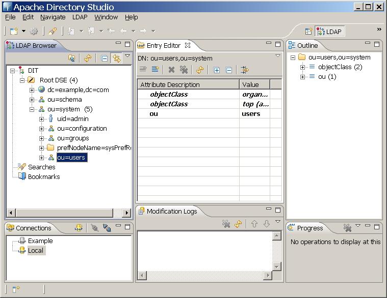 El usuario uid=admin, ou=system es un usuario que viene preinstalado, es el usuario administrador del LDAP. La password es “secret”. Hacer clic en Finish. En la lista de conexiones aparecerá el nombre “Local” e intentará conectarse al servidor. Al conectarse muestra la siguiente ventana