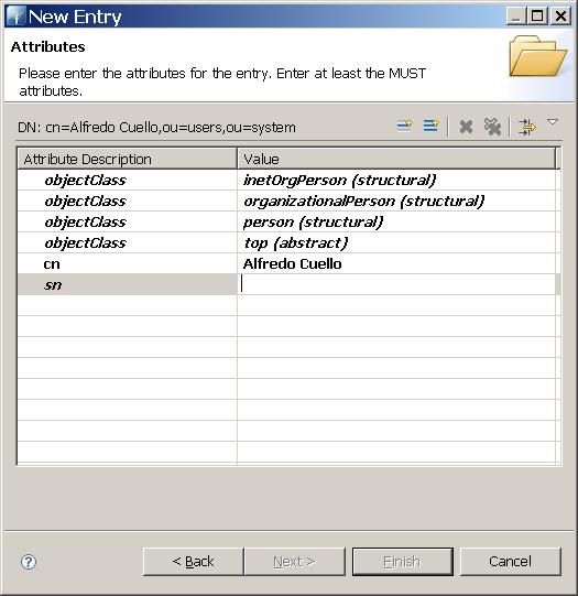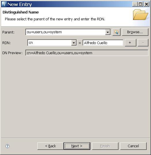 Hacer clic en Next. En la siguiente ventana seleccionar la clase inetOrgPerson y hacer clic en Add y luego en Next. En la siguiente ventana, hay que cargar el nombre del usuario, en RDN escribir “cn” En = escribir el nombre de la persona.