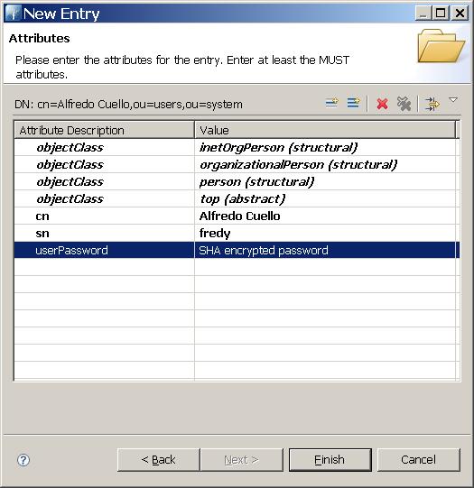 Hacer clic derecho sobre la lista, seleccionar New Attribute. En Attribute Type escribir “userPassword” y clic en Finish.