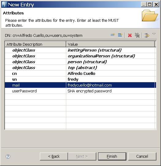 • El usuario default para conectarse a Apache directory Server es “uid=admin,ou=system”, password=“secret”