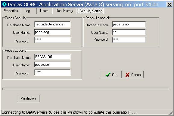 Ejecutar el administrador de PECAS, entrar con el usuario que se seleccionó como predeterminado. Seleccionar la base de datos a la que se desea entrar.