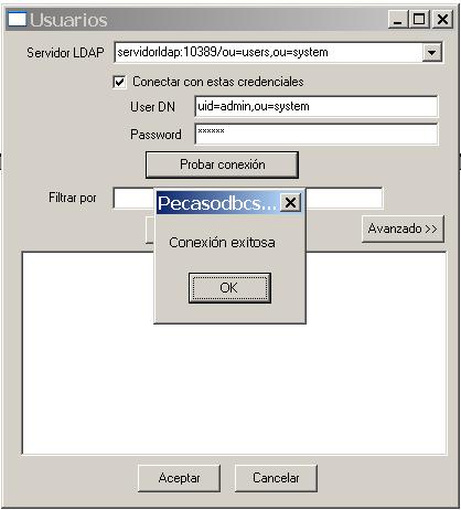 • En el diálogo de buscar usuarios, elegir “conectar con estas credenciales”. Usar “uid=admin,ou=system”, password=“secret” para conectarse al LDAP