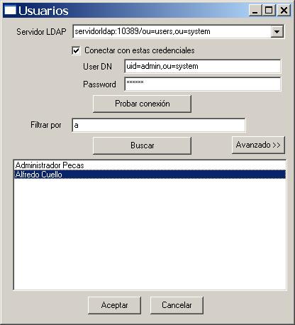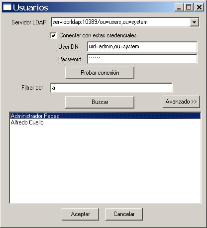 Si la conexión se pudo establecer, se puede buscar un usuario. En “Filtrar por” poner las primeras letras del nombre y hacer buscar. Se recuperan los usuarios cuyos nombres comiencen con esas letras. En este caso se buscan los usuarios que empiecen con “a” y se selecciona “Administrador Pecas”.