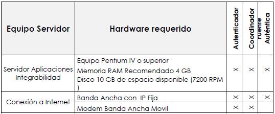 En el presente documento se describen los requerimientos de Hardware y Software de Base mínimos necesarios para la implementación de los productos requeridos para la instalación de un piloto del modelo de Integrabilidad, indicándose tanto los equipos servidores de aplicaciones, servidores de datos y los equipos de usuarios.