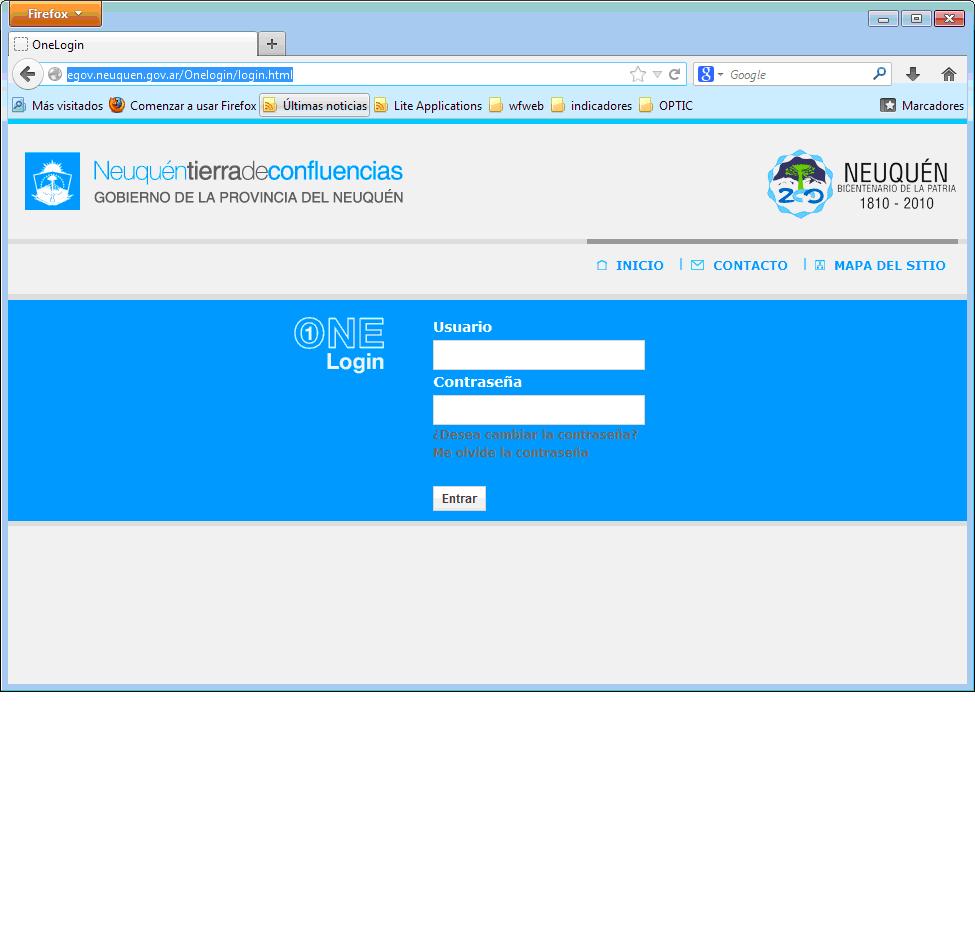 Para ingresar al sistema se despliega en primer término la pantalla de Autenticación One Login, en la dirección web: http://egov.neuquen.gov.ar/Onelogin/login.html