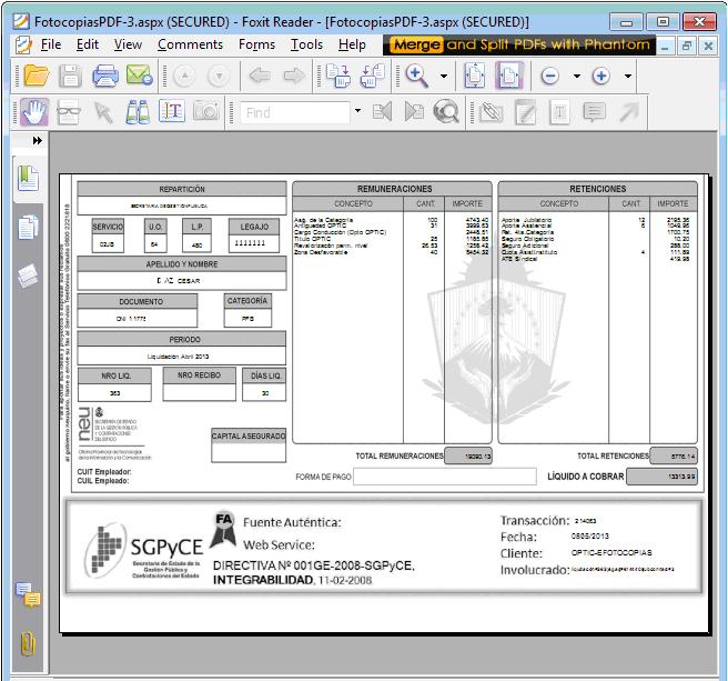 Entonces el sistema procesa y arma el resultado (un documento PDF) combinando los resultados del WS de FA y la imagen de la fotocopia que se quiere obtener.