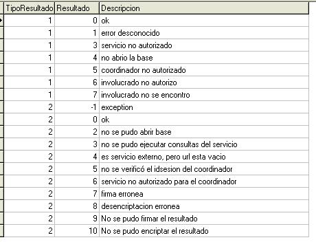 Tabla: Resultados que contiene la descripción de los posibles resultados de error al solicitar un servicio. Describe el contenido del campo ResultadoProveedor de la tabla AuditoriaFA.